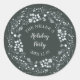 Feiertagsaufkleber mit einem grauen Winterkranz, der Ihren persönlichen Text umrahmt. Angezeigt mit einem samtgrünen Hintergrund. Perfektes Siegel für ein Office-Party-Geschenk, oder vielleicht als Weihnachts-Party-Geschenksticker.