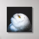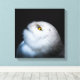 Portrait Foto eines schönen weißen Schneeauuls mit gelben Augen auf schwarzem Hintergrund.