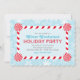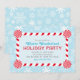 Das Winter Wunderland Thema Feiertag Einladung Design bietet einen roten Pfefferminzkerzenrahmen und Hintergrund hat ein Muster von Schneeflocken. Eisblau, Türkis, rot und weiß.