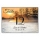 Eine festliche Tischnummer-Karte mit einer winterlichen Wunderlandschaft bei Sonnenuntergang mit festlichen Saitenlichtern.