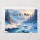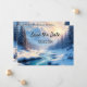 Winterkarte Save the Date mit schneebedeckter Winterlandschaft mit Flusslauf. Auf der Rückseite ist Platz für Ihr benutzerdefiniertes Foto.