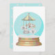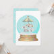 Eine Schneekugel mit einem Baby-Handy mit Wolken, einem schneebedeckten Berg und Schneyeti inmitten der Schneeflocken. Ideal für eine Babydusche oder ein Party. Bereit, um zu personalisieren. Geschehen in den Farben blau, grau, weiß und gelb.