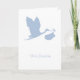 Eine Schwangerschaftsankündigungskarte mit Silhouette eines fliegenden Storches in Weiß vor einem weichen, blauen Hintergrund.