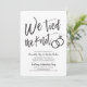 Nach dem großen Tag und den Ringen, die ausgetauscht werden, laden Ihre geehrten Gäste zu einem Fest ein. Diese Einladung enthält die Worte "Wir tied the Knot" in extravaganten Schriftzeichen. Auf der Seite davon sind ein Paar Hochzeitsringe. Unter dieser einzigartigen Grafik finden Sie einen Raum für Ihre eigenen Worte und Informationen für Ihre Post-Hochzeit-Veranstaltung.