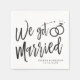Ein lustiges und einzigartiges Drehbuch mit einer Serviette, speziell auf Sie zugeschnitten, ein post-nuptial Party. Es enthält die Worte "Wir Got Verheiratet", über denen sich die Hochzeitsringe ruhen. Unter diesem und darüber sind die Namen der Braut und des Bräutigams und das Datum der Verlobung.