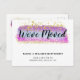 "Wir haben uns bewegt" bewegende Ankündigung Postkarte. Mit Aquarellpinselstrichen, abstrakten und goldenen Spritzern. Der Titel enthält einen handgeschriebenen Stil Kalligraphie-Schriftart.