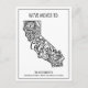 Schicken Sie Ihre Familie und Freunde diesen modernen boho California Staat neue Adresse bewegen Ansage Postcard. Dieses elegante Design zeichnet sich durch eine Schwarz-Weiß-Illustration des Staat von Kalifornien aus, die durch eine Blumenmandala hervorgehoben wird. Der obere Teil der Karte lautet "Wir sind in:" Und unter der Abbildung ist Ihr Name und Ihre neue Adresse zu personalisieren. Die Rückseite der Postkarte enthält eine Nachricht und eine Signatur, die Sie anpassen können. Entworfen von Susan Coffey.