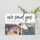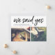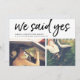 Mit diesen schicken Hochzeitsankündigungskarten, die zwei Ihrer Lieblings-Fotos nebeneinander darstellen, kündigen Sie Ihre Neuheiten nach Ihrer privaten Zeremonie oder Ihrer Veranstaltung an. "We Said Yes" erscheint oben in einer lässigen Pinselmarkierungstyp mit Namen, Hochzeitsdatum und Hochzeitsort. Die Karten kehren zu einem subtilen Rautenkatzmuster in Blassgrau und Weiß um.