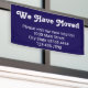 Dieses sich bewegende Werbebanner hat einen weißen Text, den Sie anpassen können. Dieses dunkelblaue Banner sagt, dass wir uns bewegt haben Bitte besuchen Sie unsere neue Position. Zusätzliche Textzeilen stehen für Ihre neue Adresse und Telefonnummer zur Verfügung.