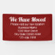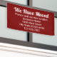 Dieses sich bewegende Werbebanner hat einen weißen Text, den Sie anpassen können. Dieses dunkelrote Banner sagt, dass wir uns bewegt haben Bitte besuchen Sie unsere neue Position. Zusätzliche Textzeilen stehen für Ihren Firmennamen, Ihre neue Adresse und Ihre Telefonnummer zur Verfügung.