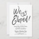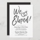 Nach dem großen Tag laden die Ringe und die Ringe zu einem Fest ein. Diese Einladung enthält die Wörter "Wir Eloped" in extravaganten Schriftzeichen. Auf der Seite davon sind ein Paar Hochzeitsringe. Unter dieser einzigartigen Grafik finden Sie einen Platz für Ihre eigenen Worte und Informationen für Ihre Post-Hochzeit-Veranstaltung. Die Rückseite enthält ein solides Schwarz, um den Look der Vorderseite schwarz / weiß Thema ergänzt.