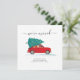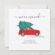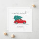 Wir haben Moved Christmas Holiday Moving Announcement mit einem roten Auto und Weihnachtsbaum mit Skript und populäre Typografie auf weißem Hintergrund.