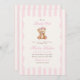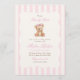Eine süße Verbeugung vor der Tradition mit einer Note zeitlosem Charme. Diese großmütterliche Babyparty-Einladung enthält weiche rosa Wasserfarbenstreifen, einen Teddybären im Vintage-Stil und elegante Typografie – perfekt, um eine kleine Dame auf dem Weg zu feiern.