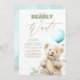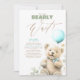 Die süßeste, absolut bezauberndste Baby-Dusche für die bald werdende Mutter und Vater. Dieses charmante Design mit einer hübschen, fröhlichen Teddy-Bären-Illustration, die das Herz schmelzen wird, ist in einer pastellfarbenen Palette von Babyblau, sanftem Beige und beruhigendem Salbei-Grün untergebracht. Die Akzente moderner, natürlicher Eukalyptus-Blätter und ein blauer Ballon, gepaart mit lustiger und spielerischer Typografie, machen diese Einladung zu einer unwiderstehlichen Leckerei, die jeden von Ohr zu Ohr begleiten wird! Matching-Produkte verfügbar. Bärenillustrierung von "FrostyDew". Dieses Design ist ausschließlich hier in meinem Laden auf Zazzle erhältlich.
