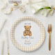 Eine rustikale Babydusche "We Can Bearly Wait" mit niedlichem Preppy-Bär mit kariertem Luxus-Design-Outfit in Braun, Beige und Gingham-Hintergrund. Sie können dies ganz einfach mit Ihren Daten personalisieren.