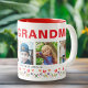 Niedlich Wir Liebe Sie Oma Blume 5 Fotos Keepake Zwei-Tone-Kaffee-Tasse. Handgezeichnet Blume in wunderschönen Frühlingsfarben und 5 Fotos Enkel. Der Text We Liebe you Oma ist in modernen und trendigen schwarzen Skript und rot kühnen Schriftart. Erstellen Sie Ihre eigene personalisierte Geschenkidee für eine Großmutter zum Muttertag, Geburtstag oder Weihnachten und fügen Sie Ihre Namen und Fotos hinzu.
