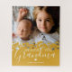Personalisiertes Großmutterbild-Puzzle mit einem wertvollen Foto, einem senftgelben Herzranddesign, dem Sprichwort "Wir Liebe Sie Oma" und den Enkelkindern.