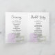 Machen Sie es Ihren Gästen leicht, mit der Zeremonie dieser schönen gefalteten Hochzeitsfeier mitzumachen. Das Design zeichnet sich durch ein atemberaubendes und romantisches Design aus, mit einem Single lang gestempelt lila oder lila farbene Rose, die auf der Seite in einem Wasserbecken spiegelt. Für die Titel gibt es eine moderne Schrift mit Raum für Details zur Zeremonie, zum Brautparty, zum Foto, einer Dankeschön-Notiz und einem kurzen Denkmal. Die Formulierung auf der Vorderseite lautet "Wir tun" mit einem niedlichen romantischen Herz zwischen den Buchstaben. Elegant und dennoch lustig, sind diese Programme eine wunderbare Ergänzung zu Ihrer Hochzeitsarbeit.