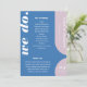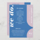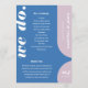 Unser minimaler Retro-Stil Hochzeitsservice-Programm ist perfekt für das trendige Ehepaar, das von Lieben stehend und kühn gesagt wird. Unser Design zeichnet sich durch eine fett hellblaue und lila Farbkombination aus. Einfache abstrakte Bogen- und Kreisformen schaffen einen kühnen Look mit "We Do", der mutig in weißem, großen Schriftart angezeigt wird. Auf der Rückseite des Hauses befindet sich ein einfaches modernes Design mit einem fett gedruckten Monogramm und einer optionalen Website-Adresse für die Hochzeit eines Paares. Von Moodthology Papery entworfen