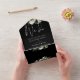 Eine einladende Hochzeitseinladung mit Blumengrün und eleganter Typografie auf schwarzem Hintergrund. Die Einladung enthält eine perforierte RSVP-Karte mit QR-Code. Entwickelt von Thisisnotme©