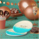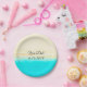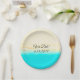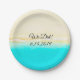 Das Meer, das aquamarine Wasser, der Sandstrand, die Teller aus Papier sind perfekt für eine Hochzeit am Strand oder eine Babydusche. Im Text steht: "Wir haben das getan", und Sie können das Datum ändern.
