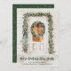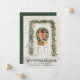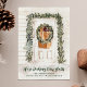 Elegante Urlaubsankündigung mit schneebedeckter Haustür mit festlichem Kranz und beleuchteter Garage. "We're Decking New Halls" wird in einem fett grünen Skript angezeigt, in dem Ihr Name und Ihre Adresse unten angezeigt werden. Die Rückseite der weihnachtlichen Ankündigung zeichnet sich durch einen grünen Hintergrund mit weißen Schneeflocken aus.
