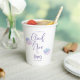 Traumhafte und elegante Babyduschtasse mit Illustration von rosa und lila Wolken. Im Text steht: "Wir sind auf Wolke neun."