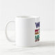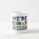 wir sind auf der Mission Coffee Tasse. Dieses Bild zeigt eine weiße Tasse mit einem Griff auf der rechten Seite. Auf der Tasse steht ein Text in verschiedenen Schriftart und Farbtönen mit "WIR SIND AUF EINER MISSION". Der Text ist so angeordnet, dass jedes Wort auf einer separaten Zeile steht, mit "WIR’RE" oben, "ON A" in der Mitte und "MISSION" unten. Es verströmt Sinn und Entschlossenheit, als ob die Tasse selbst Teil einer sinnvollen Reise wäre.