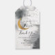 Dreamy geschlechtsneutrale Babydusche Gefälligkeitsmarke mit grauer Aquarelltextur auf der Rückseite mit Imitaten goldenen Glitzer Mond und Sternen. Im Text steht: "Wir sind über dem Mond." - "Danke, dass du mit uns gefeiert hast."