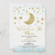 Sweet Boys's wir sind über die Mond Baby Dusche Einladung mit einem Glitzer Mond, blauen und Glitzer Sterne und Imitate Gold Kalligrafie Text. Die Einladung enthält auch ein Aquarellpapier-Bild als Hintergrund.