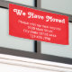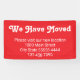 Dieses sich bewegende Werbebanner hat einen weißen Text, den Sie anpassen können. Dieses leuchtend rote Banner sagt, dass wir uns bewegt haben Bitte besuchen Sie unsere neue Position. Zusätzliche Textzeilen stehen für Ihre neue Adresse und Telefonnummer zur Verfügung.
