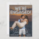 Dieses Save the Date für die Hochzeitsankündigung zeichnet sich durch ein lustiges und romantisches Design aus. Ein Beispiel-Verlobung-Foto deckt den Hintergrund ab, den Sie durch Ihr eigenes Foto oder ein anderes Bild Ihrer Wahl ersetzen können. Der Satz "Wir sind verlobt" wird in Silberfolie-Ballons über den oberen Teil gedruckt. Der Rett unserer Datums-Position und Tag werden unten in einem eleganten, weißen Schriftart gedruckt, auf der Rückseite der Ankündigung wird ein zusätzlicher Text gedruckt.