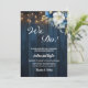 Eine elegante Einladung zur Hochzeit mit eleganter Kalligrafie, ergänzt durch wunderschönes blaues Holz, grüne Saitenleuchten und weißblaue Blumen mit goldenem Glitzer. Sie können diese Karte mit Ihren Angaben zur Hochzeit personalisieren.