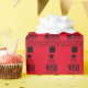 Urlaubspapier mit schwarzem Text, der lautet "Wir wünschen Ihnen ein frohes Weihnachtsfest in Form eines Weihnachtsbaumes!" Sie können den roten Hintergrund so anpassen, dass er eine beliebige Farbe will.
