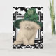 Niedliche weiße persische Langhaarkatze mit einem Vintagen grünen Hut mit einem Kleeblatt und einem großen grünen Bow. St. Patrick's Day Grußkarte mit schwarz-weißem Damast Hintergrund
