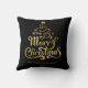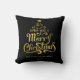 Wir wünschen Ihnen ein frohes Weihnachten personalisiertes Gold und schwarzes Kissen. Ein festliches Weihnachtskissen mit einer klassischen Botschaft in einer lustigen Weihnachtsbaumform auf rotem Hintergrund.