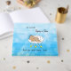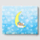 Die Babydusche eines süßen blauen Jungen mit einem von der Hand gezogenen Baby, das friedlich auf dem Mond schläft, und Wolken mit blauem und weißem Sternenhimmel. Dieses Baby wurde mit dunklerer Haut gezeichnet, um hispanische, biriziale oder afroamerikanische Babys zu repräsentieren.