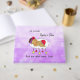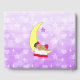 Lila und rote Mädchendusche mit handgezogenem Baby, das friedlich auf dem Mond schläft und Wolken mit einem rosa Sternenhimmel. Dieses Baby wurde mit dunklerer Haut gezeichnet, um hispanische, biriziale oder afroamerikanische Babys zu repräsentieren.