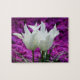 Ein kleines Puzzle von 2 weißen Tulpen auf einem fushia blühenden Hintergrund.