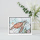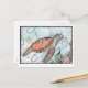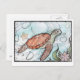 Eine wunderschöne Postkarte mit einer Meeresschildkröte, die im tiefen Ozean inmitten von Blasen und Flora schwimmt.