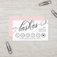 Elegante Treuekarte für Ihr lash-Geschäft mit Lashes, die in einem Wirblen Drehbuch über das Cover geschrieben sind. Fügen Sie auch Ihren Namen hinzu. Die Loyalitätskarte ist für den sechsten Besuch oder eine Behandlung mit einem Rabatt, wobei ein schwarzes Herz sie kennzeichnet. Schreiben Sie Ihren Namen, Ihre Geschäftsdaten und Ihre Kontaktinformationen auf der Rückseite mit schwarzem Text auf einem rot-rosa Hintergrund.