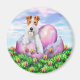 Feiern Sie Ostern mit diesem Wire Fox Terrier Schraffur aus einem farbigen Ei mit koordinierenden Tulpen, die überall herumwachsen.