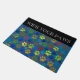 Eine bunte Fußmatte, damit Katzeninhaber Besuchern Tatzen für Gedanken mit einem Muster der Katzentatze druckt in den Losen verschiedenen Farben einschließlich Rotes, Orange, Grünes, Gelbes und Braunes, auf einem blauen Hintergrund geben. Ist oben der Auftrag "Abwischen Ihre Tatzen" in der weißen Beschriftung auf einer schwarzen Platte. Sie können den Slogan, den Schriftart und blaue die Hintergrundfarbe zum Anzug mit dem besonders anfertigen Knopf ändern. Die Türmatte würde das perfekte Geschenk für ein neues Zuhause oder einen Housewarming für katzenartige liebevolle Freunde und Familie sein.