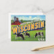 Celebrate the Dairy State with this charming retro "Greetings from Wisconsin" postcard. This classic large-letter design features quintessential Wisconsin scenery: grazing dairy cows in a green pasture set against a traditional red barn and silo. This vintage travel art is perfect for Wisconsin residents, farmers, cheese lovers, rural enthusiasts, and collectors of Americana state souvenirs. Send a charming piece of Midwest nostalgia or display it as framed art.