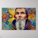 “Wisdom in Color” presents Saint Benedict with thoughtful eyes and a calm expression, surrounded by bursts of vibrant shapes. This modern portrayal honors his legacy of balance, prayer, and community. A unique reminder to seek wisdom in every season of life.