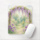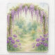 Ein zarter Bogen mit kaskadenförmigen Lavendel-Wisteria-Blume und Hydrangeas umrahmt einen ruhigen Gartenweg
