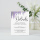 Wisteria tree pastel Wedding Details Design.Diese lila und weiße Gästekarte mit schlichtem und elegantem Design umrahmt Ihre wichtigsten Hochzeitsdetails, wie Hotel-Unterkünfte, willkommene Empfang-Informationen, Website und mehr. Fügen Sie Ihren benutzerdefinierten Text mit den angegebenen Feldern hinzu und verwenden Sie die Funktion Anpassen, um Schriftart, Größen und Abstand anzupassen. Pastellfarben sind ideal für Frühjahr- und Sommerhochzeiten. Das Design spiegelt moderne und schlichte Dekorationen der Hochzeit wider. Sie sind herzlich eingeladen, meinen Laden für schönere Produkte zu besuchen.