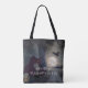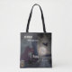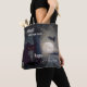 Haunted Halloween personalized tote bag featuring a night time landscape with black cat, a spider and bat at full moon. In the tree are subtle party lights.