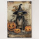 A delightfully eerie scene merges Halloween magic with rustic charm. At its center stands a classic witch figure, dressed in a tall buckled hat and flowing robes, clutching a broom while surrounded by a trio of carved pumpkins—each glowing with distinct personalities from toothy grins to mischievous smirks. Twisted branches and dried leaves swirl through the background, set against aged parchment textures and ghostly text, lending depth and folklore to the composition. Rich in atmosphere and storytelling potential, this image conjures the perfect blend of spooky fun and autumn nostalgia.