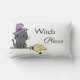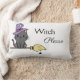 Eine bezaubernde schwarze Katze mit einem Hexenhut und auf einem Besenstiel mit den Worten: "Hexe bitte."